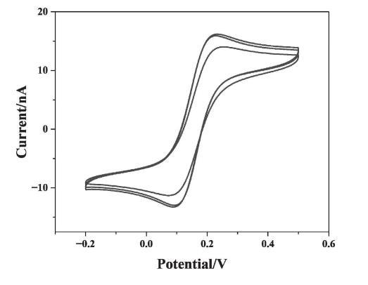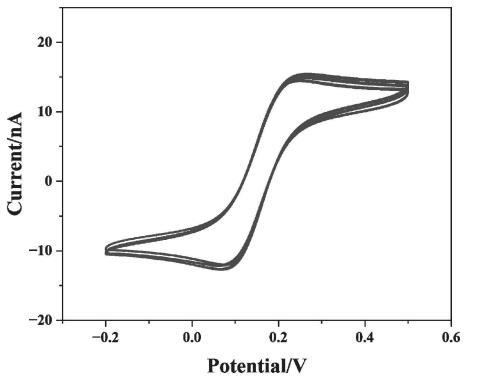 步驟5、將步驟4制得的表面可更新的金微電極用粒徑為0.05μm的氧化鋁粉拋光,并在去離子水沖洗后,置于含有0.1mol/L KCl支持電解質(zhì)的1mmol/LK3Fe(CN)6/K4Fe(CN)6(1:1)氧化還原標(biāo)準(zhǔn)溶液中,采用以拋光后的表面可更新的貴金屬微盤電極為工作電極、以鉑絲為對(duì)電極和以Ag/AgCl(飽和KCl)為參比電極組成的三電極體系,在-0.2~0.5V電位窗口,以100mV/s的掃描速率進(jìn)行循環(huán)伏安(CV)掃描處理,連續(xù)掃描5圈,記錄該表面可更新的貴金屬微盤電極的CV曲線。
