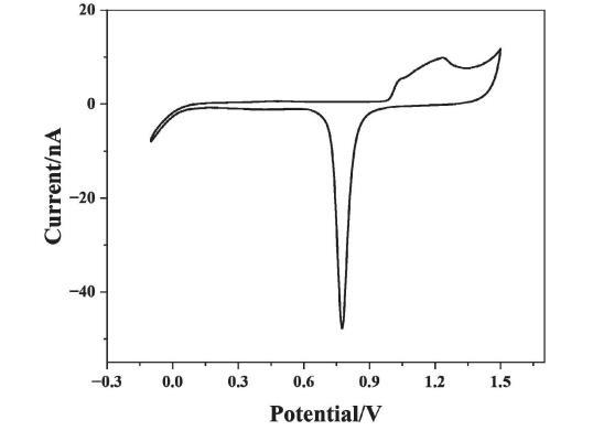 圖2,表面可更新的金微盤電極置于0.1mol/L的H2SO4水溶液中,采用以制得的表面可更新的金微盤電極為工作電極、以鉑絲為對(duì)電極和以Ag/AgCl(飽和KCl)為參比電極組成的三電極體系,在-0.1~1.5V電位窗口,以100mV/s的掃描速率進(jìn)行CV掃描處理至CV曲線穩(wěn)定,記錄該表面可更新的金微盤電極的CV曲線。