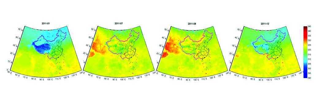 在利用驗證結(jié)果完善反演算法的基礎(chǔ)上,開展了我國氧化亞氮濃度的時空變化反演分析。如圖2所示為2011年我國氧化亞氮濃度的月均值分布圖,時空分布顯示,我國氧化亞氮濃度月度間變化比較明顯,從1月份開始,氧化亞氮濃度逐月遞增,8月份最高,之后逐月遞減。