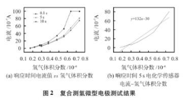 根據(jù)復(fù)合電極電化學(xué)測(cè)試結(jié)果和宏觀傳感器的測(cè)試結(jié)果對(duì)比,發(fā)現(xiàn)復(fù)合電極測(cè)得電流和氫氣體積分?jǐn)?shù)存在明顯的線性關(guān)系,且數(shù)據(jù)與宏觀傳感器非常吻合。即復(fù)合電極尺寸變小了,但測(cè)試結(jié)果卻幾乎沒有影響。