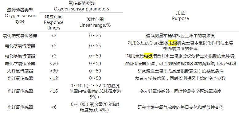 表1歸納對比了典型土壤氧傳感器的類型和適用范圍。氧化鋯氧傳感器具有較高的測量精度,響應(yīng)速度較快,能夠迅速反映氧氣濃度的變化,但使用時必須加熱,而高溫會影響土壤氧環(huán)境,對測量結(jié)果產(chǎn)生較大影響,因此在土壤氧氣檢測領(lǐng)域應(yīng)用較少。電化學(xué)氧傳感器原理簡單、精度高,但檢測過程中存在消耗氧氣和電極材料等問題,無法長期原位監(jiān)測,檢測結(jié)果不穩(wěn)定、重復(fù)性較差的問題,這與傳感器的腔室、電極和透氧膜的制作有關(guān)。光纖氧傳感器不需要消耗氧分子,也無需對樣品進(jìn)行任何處理,可實現(xiàn)長期原位監(jiān)測,在氧氣檢測領(lǐng)域具有很好的發(fā)展趨勢。但需要精密的光學(xué)儀器,且氧傳感膜的制作工藝?yán)щy,成本較高。