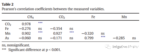 總CH4排放量,總CO2排放量和淋溶Mn總量之間存在顯著正相關(表2)。與我們的預期相反,淋溶鐵的總量與淋溶砷的總量僅具有顯著的正相關。