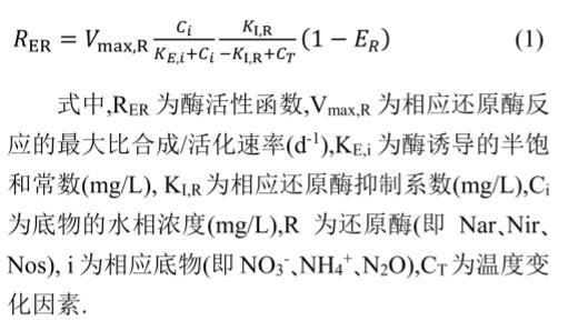 式中:RER為酶活性函數;Vmax,R為相應還原酶反應的最大比合成/活化速率,d-1;KE,i為酶誘導的半飽和常數,mg/L;KI,R為相應還原酶抑制系數,mg/L;Ci為底物的水相濃度,mg/L;R為還原酶(即Nar、Nir、Nos);i為相應底物(即NO3-、NH4+、N2O);CT為溫度變化因素。