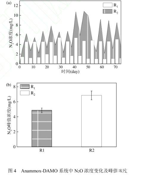 2.1.2溫度對Anammox-DAMO系統N2O產消的影響由圖4可知,2個系統均觀察到了明顯的N2O產消,且R2系統中N2O的總體累積量大于R1系統,其中R1系統N2O平均峰值濃度為(4.86±0.30)mg/L,R2系統為(6.85±0.59)mg/L.