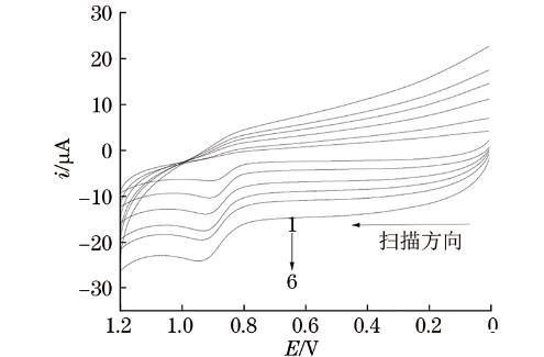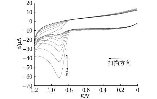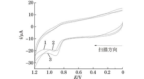 試驗考察了L-谷氨酸聚合圈數分別為2,4,6,8,10,12圈時對亞硝酸鈉氧化峰電流的影響。結果表明:隨著聚合圈數的增加,氧化峰電流先增大后減?。划斁酆先禐?圈時,氧化峰電流較大。因此,試驗選擇的聚合圈數為6圈。