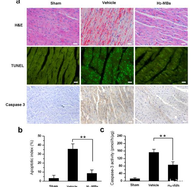 圖5、H2-MBs保護(hù)心肌結(jié)構(gòu)并減少心肌細(xì)胞凋亡。(a)來(lái)自接受假手術(shù)處理、車(chē)輛處理或H2-MB處理的大鼠的心臟切片的組織學(xué)分析,這些大鼠經(jīng)過(guò)30分鐘缺血和24小時(shí)再灌注;這些切片的H&E染色如圖所示(上排)。接受對(duì)照微泡MB的大鼠心臟在缺血區(qū)顯示明顯出血和壞死(上排,中間),但H2-MBs處理的大鼠的心肌損傷減輕了(上排,右側(cè))。進(jìn)行了TUNEL染色以檢測(cè)心肌細(xì)胞的凋亡(中排),發(fā)現(xiàn)接受車(chē)輛MB的大鼠中TUNEL陽(yáng)性細(xì)胞的數(shù)量顯著增加(中排,中間)與接受假手術(shù)處理的大鼠相比(中排,左側(cè))。接受H2-MBs的大鼠顯示TUNEL陽(yáng)性細(xì)胞數(shù)量顯著減少(中排,右側(cè))。進(jìn)行了免疫組化染色以檢測(cè)caspase-3的表達(dá)(下排),發(fā)現(xiàn)接受對(duì)照微泡MB的大鼠心肌中的caspase-3表達(dá)相對(duì)較高(下排,中間)與接受假手術(shù)處理的大鼠相比(下排,左側(cè))。接受H2-MBs的大鼠顯示caspase-3表達(dá)減少(下排,右側(cè));刻度條=50μm。(b)通過(guò)計(jì)算五個(gè)高倍視野中TUNEL陽(yáng)性核的百分比來(lái)繪制凋亡指數(shù)圖,顯示H2-MB處理的大鼠中TUNEL陽(yáng)性核的數(shù)量顯著減少與車(chē)輛組相比(n=5)。