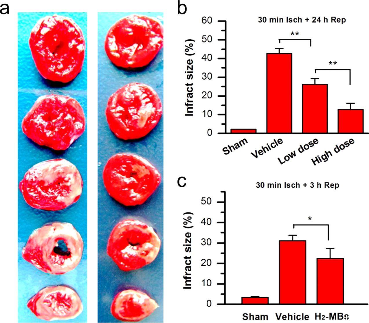 開(kāi)發(fā)了一種新穎的、圖像引導(dǎo)的治療性H2輸送系統(tǒng),簡(jiǎn)單易用,由此產(chǎn)生的H2-MBs極大地提高了單位體積溶液中的H2溶解度。更重要的是,H2-MBs可以被視覺(jué)跟蹤,并用于保護(hù)心肌缺血再灌注損傷。研究為基于H2的治療應(yīng)用的臨床轉(zhuǎn)化提供了潛在解決方案。