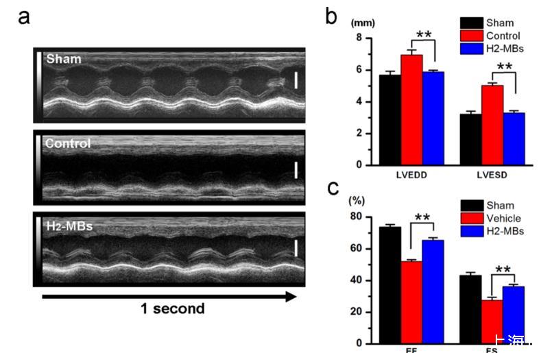 圖4、H2-MBs減少不良的LV重塑。(a)接受假手術(shù)處理(假手術(shù))、缺血再灌注對(duì)照微泡處理或缺血再灌注H2-MBs處理的大鼠的代表性M模式超聲心動(dòng)圖像。對(duì)每組的M模式超聲圖像的測(cè)量是在缺血再灌注后48小時(shí)進(jìn)行的。使用裝備有MS-250掃描頭探頭的Vevo 2100系統(tǒng)進(jìn)行成像,掃描速度為1000 Hz,頻率為21 MHz。刻度條(垂直),4 mm。(b)基于超聲心動(dòng)圖像,確定了LV尺寸,包括左室舒張末期直徑(LVEDD)和左室收縮末期直徑(LVESD)(n=5)。**P<0.01。數(shù)據(jù)表示平均值±s.d。(c)與對(duì)照組相比,H2-MB處理的大鼠的心臟收縮功能(FS%)和射血分?jǐn)?shù)(EF%)顯著改善(n=5)。