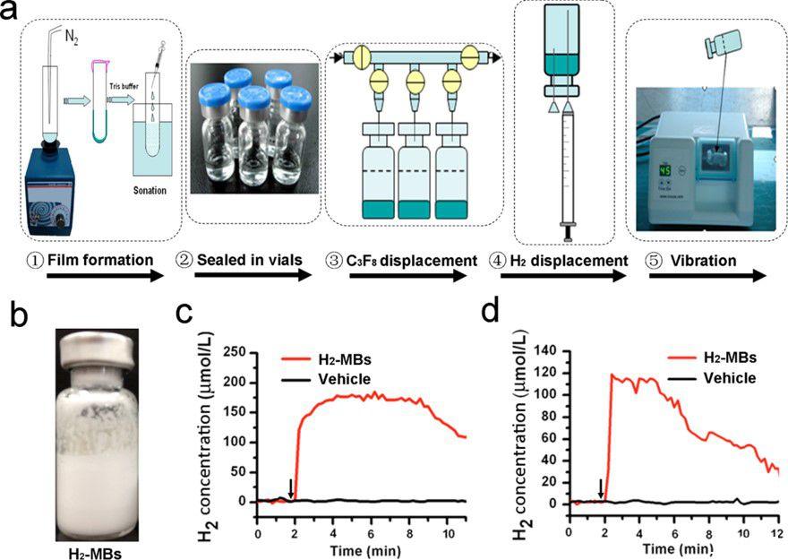 研究簡(jiǎn)介:心肌缺血再灌注損傷常見(jiàn)于心臟血流恢復(fù)后,如在心臟病發(fā)作后的血液再通或心臟手術(shù)后。這種損傷會(huì)導(dǎo)致組織破壞,可能引起心力衰竭。損傷的一個(gè)主要原因是活性氧自由基(ROS)的過(guò)度產(chǎn)生,特別是在再灌注的最初幾分鐘內(nèi)。ROS的產(chǎn)生觸發(fā)線(xiàn)粒體通透性過(guò)渡孔的開(kāi)放,導(dǎo)致細(xì)胞死亡程序、微血管功能障礙和炎癥級(jí)聯(lián)反應(yīng)。氫氣(H2)作為一種抗氧化劑,已經(jīng)顯示出在預(yù)防和治療缺血再灌注引起的致命損傷方面具有巨大潛力。H2具有選擇性減少細(xì)胞毒性ROS的能力,同時(shí)不影響代謝氧化還原反應(yīng)或破壞其他ROS參與的細(xì)胞信號(hào)傳導(dǎo)。H2能夠穿透生物膜,快速擴(kuò)散到細(xì)胞質(zhì)、線(xiàn)粒體和細(xì)胞核中,有效減少細(xì)胞毒性自由基。此外H2是一種對(duì)人類(lèi)安全、無(wú)明顯副作用的氣體。盡管氫氣的治療效果已被廣泛證明,但將其應(yīng)用于臨床治療仍面臨挑戰(zhàn)。主要問(wèn)題包括H2在水、鹽水或血液中的溶解度低,導(dǎo)致其在血液和受損組織中的生物利用度較差。此外,H2的易燃性在制備含H2配方時(shí)造成了困難和安全隱患。因此開(kāi)發(fā)新的、安全的H2傳遞系統(tǒng)以有效治療具有重要意義。微泡是小的充氣微球,通常用于超聲診斷中作為對(duì)比增強(qiáng)劑。MBs也是重要的藥物傳遞載體,可以在血液循環(huán)中穩(wěn)定攜帶藥物,并具有多種治療應(yīng)用。藥物可以加載到MB殼上、嵌入到殼矩陣中,或加載到內(nèi)部空間中。MBs作為封裝治療性氣體的載體,為提高H2的生物利用度提供了新的可能性。本研究人員開(kāi)發(fā)了一種超聲可視的H2傳遞系統(tǒng),通過(guò)將H2裝載在微泡內(nèi)(H2-MBs)來(lái)預(yù)防心肌缺血再灌注損傷。這種系統(tǒng)可以在常溫和常壓條件下大大提高單位體積中的H2濃度,并且H2-MBs可以在超聲成像系統(tǒng)中進(jìn)行可視跟蹤,有效釋放其治療氣體。提供了一種新的方法來(lái)提高氫氣在生物醫(yī)學(xué)應(yīng)用中的有效性,特別是在預(yù)防心肌缺血再灌注損傷方面。通過(guò)使用H2-MBs,研究人員能夠克服H2溶解度低和生物利用度差的問(wèn)題,同時(shí)利用超聲成像技術(shù)實(shí)現(xiàn)對(duì)H2輸送的實(shí)時(shí)監(jiān)控。