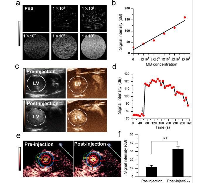 圖2、H2-MBs的超聲信號(hào)檢測(cè)。(a)H2-MBs分散在各種濃度(5×105、5×106、5×107、5×108和5×109/mL)的PBS中的超聲圖像。使用Vevo 2100超聲成像系統(tǒng)進(jìn)行成像。(b)PBS中H2-MBs的超聲信號(hào)強(qiáng)度的定量分析。(c)大鼠心臟LV中H2-MBs在靜脈尾部注射H2-MBs前后的超聲圖像。使用Vevo 2100超聲成像系統(tǒng)進(jìn)行成像(n=3)。上排,注射H2-MBs前;下排,注射H2-MBs后;左側(cè)面,B模式圖像;右側(cè)面,對(duì)比模式圖像;LV,左心室(點(diǎn)線(xiàn)循環(huán))。(d)H2-MBs注射進(jìn)入大鼠后300秒的時(shí)間-強(qiáng)度曲線(xiàn)。箭頭表示MB注射的時(shí)間。(e)大鼠心肌組織中H2-MB輸送的超聲圖像。使用Philips IE33超聲機(jī)進(jìn)行成像。左側(cè),注射H2-MBs前;右側(cè),注射H2-MBs后;LV,左心室(紅色循環(huán));IVS,心室間隔(藍(lán)色循環(huán));RV,右心室(綠色循環(huán))。箭頭表示靜脈注射H2-MBs后H2-MB輸送到大鼠心肌組織中的情況。(f)H2-MBs的超聲信號(hào)強(qiáng)度的定量分析。