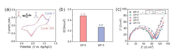 圖4:MWCNT-g-P(TMPMA-co-TMA)的電化學(xué)表征。(a)MWCNT-g-P(TMPMA-co-TMA)電極的循環(huán)伏安曲線;(b)接枝和混合態(tài)P(TMPMA-co-TMA)電極的ECSA比較;(c)MWCNT-g-P(TMPMA-co-TMA)電極在不同P(TMPMA-co-TMA)接枝厚度下的EIS曲線。