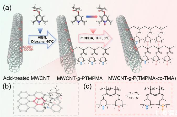 圖1:(a)MWCNT-g-P(TMPMA-co-TMA)的合成,包括自由基聚合和氧化步驟;(b)P(TMPMA-co-TMA)共價(jià)接枝在MWCNT上的詳細(xì)圖;(c)電控制下氮氧化物自由基(N-O?)與氧銨離子(O=N+)的相互轉(zhuǎn)化。隨后,采用一系列的表征手段評(píng)估聚合物的存在狀態(tài)以及氧化還原活性。熱重紅外聯(lián)用(TG-IR)分析揭示了共聚物在MWCNT上的接枝密度、重量和特征基團(tuán)。透射電子顯微鏡(TEM)表征則直接觀察到了接枝和物理混合狀態(tài)下聚合物形態(tài)學(xué)的顯著差異。電化學(xué)活性表面積(ECSA)測(cè)試反映了形態(tài)學(xué)差異帶來的電化學(xué)反應(yīng)活性的影響。循環(huán)伏安法(CV)、電子自旋共振(EPR)和X射線光電子能譜(XPS)測(cè)試進(jìn)一步證明了材料合成過程中N-H被氧化為N-O?,并且在電位調(diào)控下,N-O?與+N=O之間發(fā)生了相互轉(zhuǎn)化。