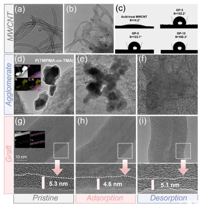 圖3:MWCNT與P(TMPMA-co-TMA)的形貌表征;(a)MWCNT的透射電子顯微鏡(TEM)圖像;(b)接枝P(TMPMA-co-TMA)后MWCNT的TEM圖像;(c)不同接枝量P(TMPMA-co-TMA)的電極表面接觸角;(d-f)聚集態(tài)P(TMPMA-co-TMA)吸附與解吸過程的TEM圖像及元素分布圖;(g-i)MWCNT-g-P(TMPMA-co-TMA)吸附與解吸過程的TEM圖像及元素分布圖。