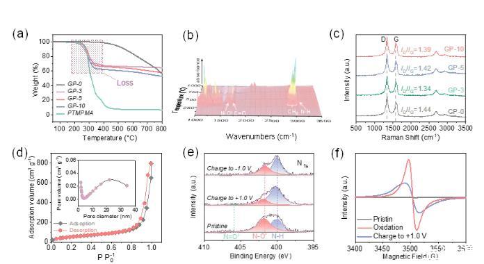圖2:MWCNT-g-P(TMPMA-co-TMA)的表征。(a)不同接枝量MWCNT-g-P(TMPMA-co-TMA)的熱重分析(TGA)曲線;(b)熱重分析獲得的P(TMPMA-co-TMA)裂解產(chǎn)物的傅里葉變換紅外光譜(FT-IR);(c)原始MWCNT和接枝不同量P(TMPMA-co-TMA)的拉曼光譜;(d)MWCNT-g-P(TMPMA-co-TMA)的氮?dú)馕?解吸等溫線;(e)XPS N1s高分辨光譜,顯示通過電化學(xué)控制的胺基、氮氧自由基和氨氧離子三種氮狀態(tài);(f)PTMPMA、經(jīng)mCPBA氧化的P(TMPMA-co-TMA)以及通過電化學(xué)控制在1.0 V下由氮氧自由基轉(zhuǎn)變?yōu)榘毖蹼x子的EPR光譜。