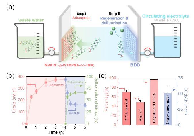 圖7:真實(shí)工業(yè)廢水處理中電吸附捕獲與轉(zhuǎn)化。(a)MWCNT-g-P(TMPMA-co-TMA)與BDD點(diǎn)擊耦合用于PFOA的電化學(xué)捕獲與轉(zhuǎn)化的示意圖(再生與脫氟過程在含50 mM Na2SO4的溶液中進(jìn)行);(b)在不對(duì)稱的MWCNT-g-P(TMPMA-co-TMA)||BDD裝置中,工業(yè)廢水處理過程中PFOA的累積量與脫氟效率的變化(吸附與再生過程中);(c)工業(yè)廢水處理中的PFOA去除率、再生率、脫氟效率與能耗。‘’