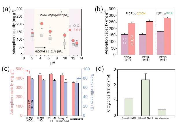 圖6:MWCNT-g-P(TMPMA-co-TMA)在不同條件下對(duì)PFOA的吸附容量。(a)在不同pH值條件下的PFOA吸附容量;(b)不同鏈長(zhǎng)和頭基的PFAS的吸附容量;(c)在不同水質(zhì)基質(zhì)中PFOA的吸附和去除率;(d)氧化過程生成ClO??的情況。