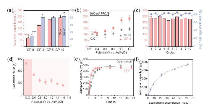 圖5:氧化還原共聚物電極的吸附與解吸性能。(a)不同接枝含量MWCNT-g-P(TMPMA-co-TMA)的PFOA吸附容量和再生效率;(b)不同電位下的吸附容量比較(在20 mM NaCl和100μM PFOA中測(cè)試);(c)MWCNT-g-P(TMPMA-co-TMA)10個(gè)循環(huán)中的PFOA吸附容量和再生效率;(d)不同電位下聚合物電極對(duì)PFOA與Cl?的分離因子;(e)在開路電位和1.0 V下PFOA的吸附動(dòng)力學(xué);(f)電吸附等溫線。