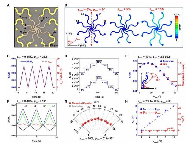 圖3.生物可降解、可拉伸和生物兼容的硅納米條帶全向應(yīng)變傳感器