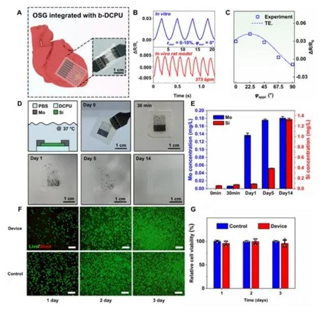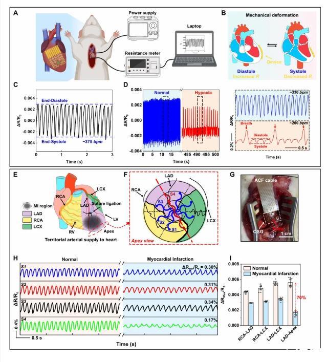 植入放大微電極系統(tǒng)作為一種可穿戴、可植入的平臺,適用于生物力學(xué)信號的監(jiān)測,且具備良好的生物兼容性。八爪魚狀的納米條帶展現(xiàn)了對不同方向應(yīng)變的特異性響應(yīng)。體外測試顯示,該傳感器的應(yīng)變方向檢測偏差僅為1°,最小應(yīng)變強(qiáng)度檢測靈敏度為0.1%。其對應(yīng)變具有極高的靈敏度,能夠?qū)崟r監(jiān)測生物力學(xué)信號(如眼內(nèi)壓波動和脈搏)。在醫(yī)學(xué)應(yīng)用方面,體內(nèi)大鼠模型實(shí)驗(yàn)證實(shí)了其在檢測心肌梗死和心臟缺氧等病理的有效性。此外,集成可降解聚合物作為封裝后使得該設(shè)備能夠在體內(nèi)完全降解且保有生物兼容性。這項(xiàng)研究為復(fù)雜組織表面生物力學(xué)的持續(xù)監(jiān)測提供了一種全新的臨床應(yīng)用技術(shù)方案。