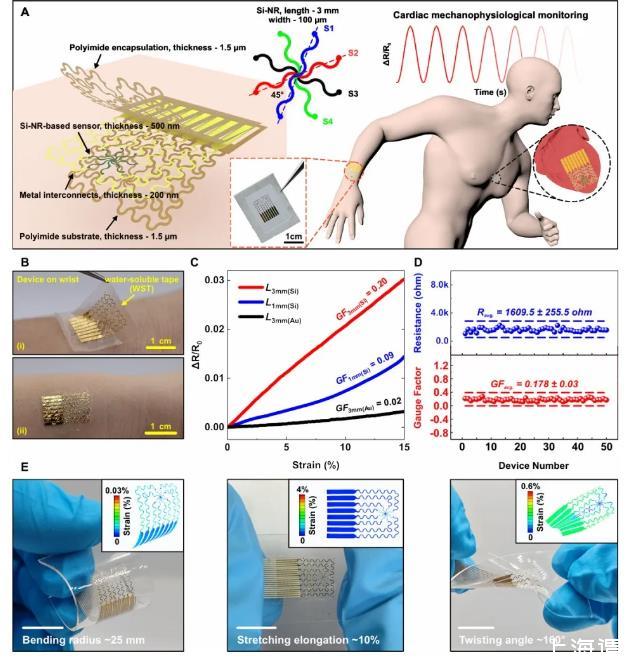 圖1.用于軟組織生物力學(xué)監(jiān)測的基于硅納米條帶的超薄全向應(yīng)變傳感器