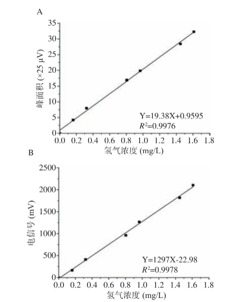 圖3頂空-氣相色譜法(A)和氫氣微電極法(B)檢測水中氫氣含量標準曲線