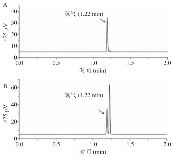 圖1氫氣(A)及富氫水樣本(B)頂空進樣色譜圖