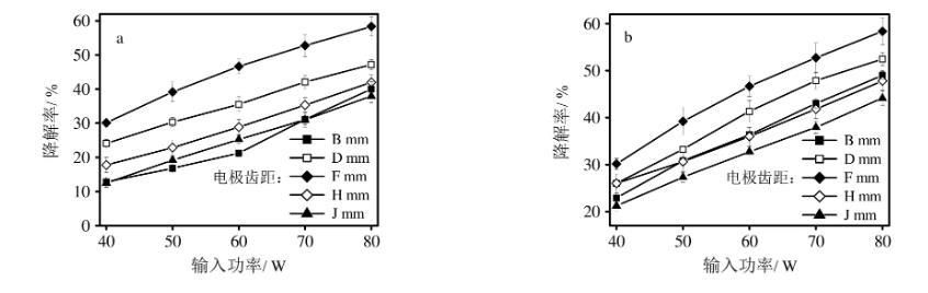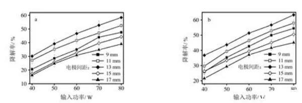 典型電極間距與氨氣和硫化氫的降解效果的關(guān)系如圖3所示。實(shí)驗(yàn)條件:1)外施電壓為220V;2)空氣流量為5 m3/h;3)電極齒距為6 mm;4)電極高度為8 mm;5)氨氣濃度為340 mg/m3,硫化氫濃度為500 mg/m3;6)溫度為30℃,相對(duì)濕度為35%,考察電極間距為9 mm、11 mm、13 mm、15 mm、17 mm時(shí)的氨氣和硫化氫降解效果關(guān)系。由圖3可知,在不同輸入功率情況下,氨氣和硫化氫的降解率先隨著電極間距的增加而增大,當(dāng)電極間距為13 mm時(shí)達(dá)到最大值,而后隨著電極間距的進(jìn)一步增大而逐漸降低,得到電極間距為13 mm時(shí)具有最大的氨氣和硫化氫降解率??赡艿脑蚴钱?dāng)電極間距增加時(shí),電極的單針?lè)烹姽β屎头烹娔芰棵芏入S之增加,但當(dāng)電極間距過(guò)大時(shí),兩者隨之降低。同時(shí)考慮電極間距增大利于放電穩(wěn)定,所以確定最佳電極間距為13 mm左右。