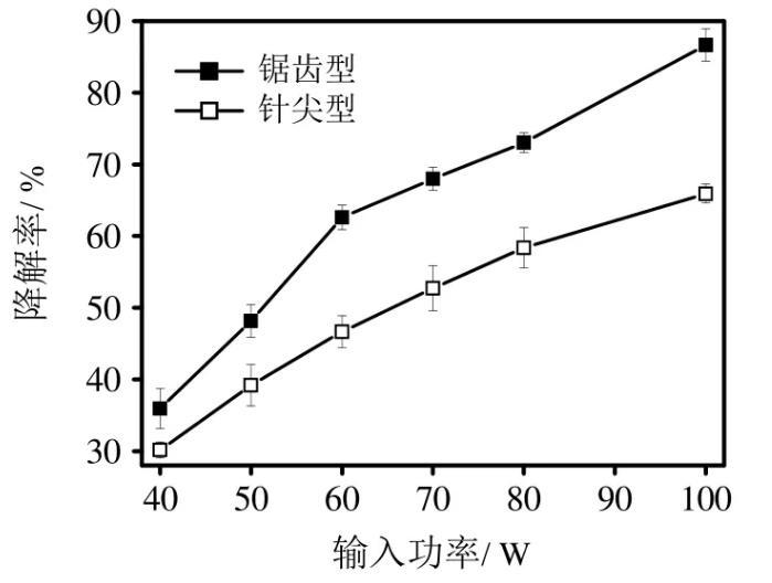 4)在不同外施功率下,鋸齒型的氨氣降解率均顯著性高于針尖型。
