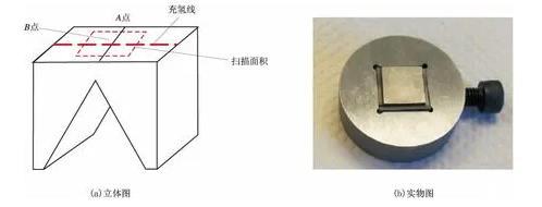 試樣如圖1所示,尺寸為10 cm×10 cm×10 cm,并開一個49°V形槽,通過螺栓負荷裝置對試樣施加1 000 N的力(圖1(b))。為了避免試樣和螺栓裝置的直接接觸,在試樣和螺栓裝置中間的間隙內安裝四根聚甲基丙烯酸酯絕緣桿。試樣的工作面依次用1000#金剛石砂紙磨平,然后用金剛石研磨膏拋光至1~3μm。