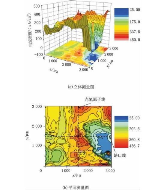 此外,試樣的充氫溶解率也可以通過圖4(a)和圖4(b)來描述。充氫前電流基本上是均勻的,平均電流密度是40μA/cm2,充氫后其初始電流密度增加到80μA/cm2。這是因為充氫加速了腐蝕的反應速率,之后經過SVET測量電流密度降到65μA/cm2,這要歸因于逐漸增厚的腐蝕產物層。然而,總的溶解電流密度仍要遠遠大于充氫前的電流密度。
