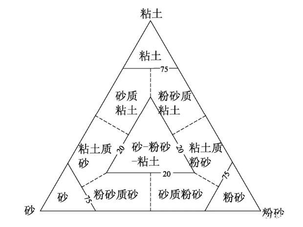 淺海沉積物主要源于陸源碎屑沉積,因此物質組成與陸源物質非常相似。碎屑沉積物根據其粒度特征可以分為礫、砂、粉砂和粘土四大類,這4種不同粒級組分的百分含量是沉積物分類與命名的基礎。粒級的劃分目前主要采用Udden-Wentworth的方案。1954年謝帕德總結了美國工程界、土壤界以及石油界對碎屑沉積物的分類方案,并提出新的分類方法,即謝帕德(1954)分類(圖1)。該方案被廣大沉積學者普遍接受,在海洋地質學界推廣使用。1970年福克又在礫石、砂和泥的分類基礎上提出了一種新的分類方案,即福克(1970)分類。