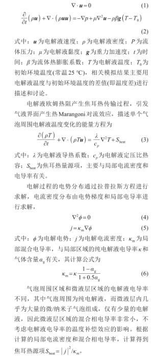 本文作者基于前期獲得的水平微電極表面單個氫氣泡生長行為實驗數(shù)據(jù),采用固定氣泡直徑模型對實驗電流密度條件下連續(xù)多個氣泡生長時刻的不同直徑氣泡周圍的Marangoni對流效應進行數(shù)值模擬,開發(fā)基于微液層模型的電場分布和傳熱過程計算方法,揭示氣液界面溫度場及Marangoni對流結構的演變規(guī)律。