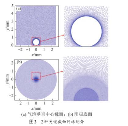 圖1所示為局部放大顯示的微電極表面單個氫氣泡生長示意圖。本文模擬設計的氣泡半徑Rb和氣泡接觸半徑Rc來源于恒電流密度為5 A/cm2條件下的氣泡幾何尺寸實驗,定義氣泡弧長從氣泡接觸點開始到氣泡頂點結束(圖1中深藍色弧線),氣泡接觸角為θ,氣液界面圓周角度為φ(φ≥θ)。計算區(qū)域的氣泡底部微液層為圓柱結構,微液層底部直徑與微電極直徑相同。為簡化求解,本文設計氣泡底部平均微液層厚度為5μm。在實際電解過程中,氣液界面和氣泡底部微液層區(qū)域的物理場參數(shù)變化較大,為保證計算結果的準確性,需要對這2個區(qū)域進行網(wǎng)格加密處理。圖2所示為三維圓柱模型中的氣泡垂直中心截面和陰極底部面的網(wǎng)格劃分和加密處理情況,從圖2可見:氣液界面和氣泡底部微液層區(qū)域的網(wǎng)格非常小,氣液界面最小網(wǎng)格尺寸為1.2μm,氣泡底部微液層最小網(wǎng)格尺寸為0.5μm。