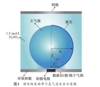 為探明電解水制氫電極表面氣泡動力學行為,諸多學者主要采用高速攝影可視化、電化學測量和理論分析等方法研究氣泡生長、黏附和脫離等行為。當溶解氫分子濃度達到過飽和濃度條件時,電極表面成核點處產(chǎn)生氣泡,隨后氣泡繼續(xù)在電極表面生長和黏附。學術界主要采用理論分析結合電化學實驗的方法研究電極表面氣泡生長過程中的氣液傳質(zhì)行為。當電極尺寸明顯大于氣泡直徑時(常指宏觀電極),目前普遍認為氣泡生長行為受氣液界面擴散主導控制,并提出了相關氣液界面擴散傳質(zhì)速率模型。而對于電極尺寸非常小的微電極表面,目前僅從理論上推測氣泡生長行為受微液層直接注入控制。