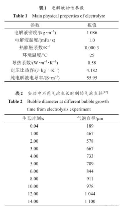 對于考慮Boussinesq假設的電解液自然對流過程,為了提高計算收斂穩(wěn)定性,采用非穩(wěn)態(tài)迭代方法進行計算,當監(jiān)測的氣液界面若干位置處的溫度和速度保持不變,即認為計算過程達到收斂。定義微電極表面為實際實驗的電流密度,定義陽極表面為壓力出口。將氣液界面定義為熱Marangoni對流邊界條件,表面張力隨溫度變化的系數(shù)為-1.5×10-4N/(m·K),其他壁面定義為無滑移壁面邊界條件。采用用戶自定義標量函數(shù)UDS求解槽內(nèi)電勢分布,混合相電導率和焦耳熱源項均采用了用戶自定義函數(shù)UDF進行編程計算。計算過程中的連續(xù)性方程和動量方程均采用二階迎風格式,能量方程和UDS方程采用Quick格式,壓力-速度耦合采用Phase-Coupled SIMPLE算法,所有計算方程的松弛因子均采用默認值,時間步長為1 ms。模擬所需的電解液物性參數(shù)如表1所示,微液層內(nèi)氣體的體積分數(shù)約為94%,計算得到微液層混合相電導率為2.28 S/m。為了系統(tǒng)研究氣泡生長周期內(nèi)氣泡周圍Marangoni對流效應的演變規(guī)律,對不同氣泡生長時刻對應的不同氣泡尺寸模型進行數(shù)值模擬,結果如表2所示。