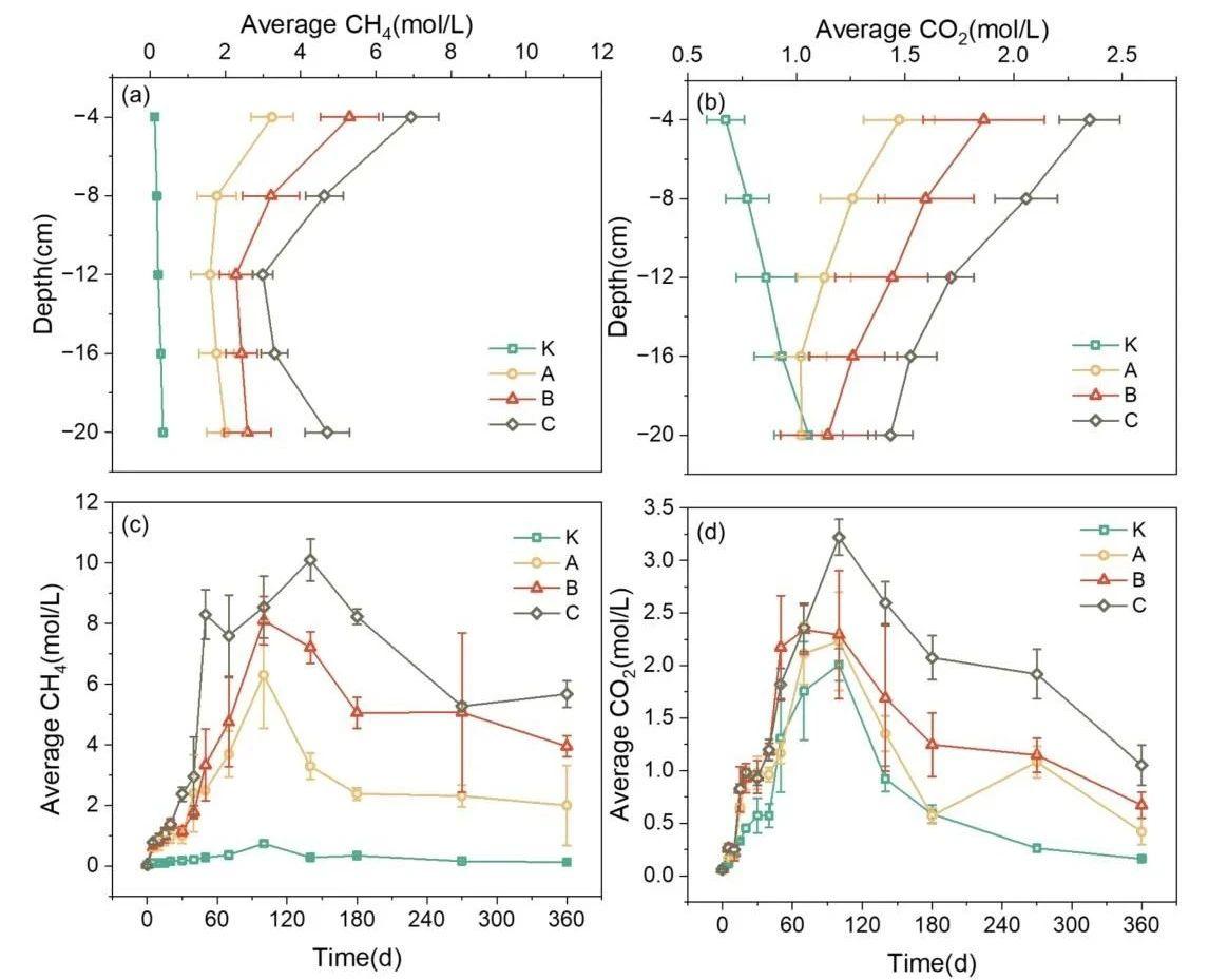 圖6微宇宙系統中不同藍藻生物量添加下(a)不同沉積物深度CH4溶存濃度;(b)不同沉積物深度CO2溶存濃度;(c)培養周期內CH4溶存濃度變化;(d)培養周期內CO2溶存濃度變化。