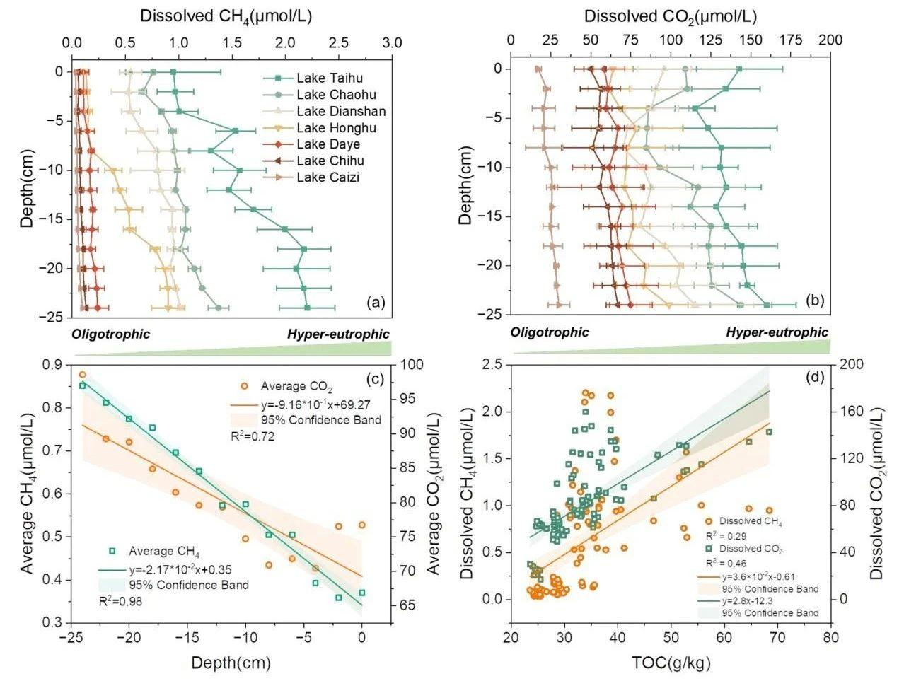 圖3長江中下游流域湖泊群(a)不同沉積物深度間隙水中溶存態CH4濃度;(b)不同沉積物深度間隙水中溶存態CO2濃度;(c)不同沉積物深度與溶存態CH4和CO2濃度的相關性;(d)不同沉積物TOC與溶存態CH4和CO2濃度的相關性。