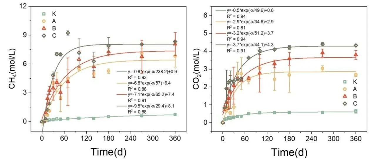 圖4微宇宙系統中不同藍藻生物量添加下(a)CH4累積濃度(b)CO2累積濃度