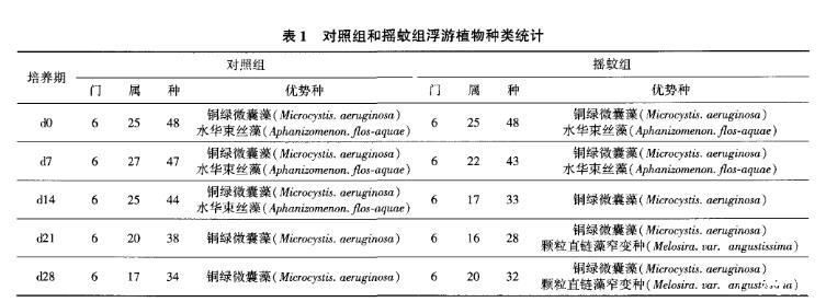 表1對照組和搖蚊組浮游植物種類統計