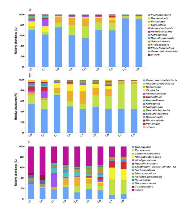 圖2.CF-SiFh電極主導(dǎo)MFC中陽(yáng)極生物膜的微生物群落結(jié)構(gòu)在門水平(a)、類水平(b)和屬水平(c)的變化