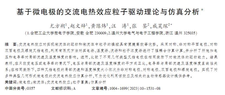 摘要:交流電熱效應(yīng)對實現(xiàn)微流體的驅(qū)動和微流體中粒子的操控具有便捷高效等優(yōu)勢。采用對稱、非對稱平面電極、對稱雙面電極及螺旋叉指電極,利用有限元方法對其電場、溫度場、流場和粒子濃度場進行了強耦合仿真計算,并分析了所施加電壓和電導率對局部流速及溫度梯度的影響。