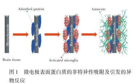活體原位電化學分析方法是將微電極植入特定腦區原位監測神經化學物質動態變化的方法,該方法因具有高時空分辨率、高靈敏度和對腦組織損傷小等優勢,受到越來越多的關注。但腦環境較為復雜,不僅存在許多小分子物質,而且還包含許多生物大分子。當微電極植入到腦組織時,生物大分子(特別是蛋白質)會迅速地吸附在微電極表面(此過程被認為是生物污染的第一步)。吸附的蛋白質會覆蓋電極表面部分活性位點,阻止物質傳輸和電子(電荷)轉移,最終導致微電極的靈敏度和選擇性降低。此外,微電極將不可避免地導致一系列不良的生物反應,如細胞黏附、血小板活化、血栓形成以及補體激活。這些過程將會導致電極周圍化學環境的改變,從而影響微電極對神經化學物質檢測的準確性。此外,形成的纖維囊會完全阻礙電極表面上的電子轉移和物質傳輸,從而導致微電極無法正常工作(圖1)。因此,抑制蛋白質的非特異性吸附在一定程度上可防止電極表面生物污染。
