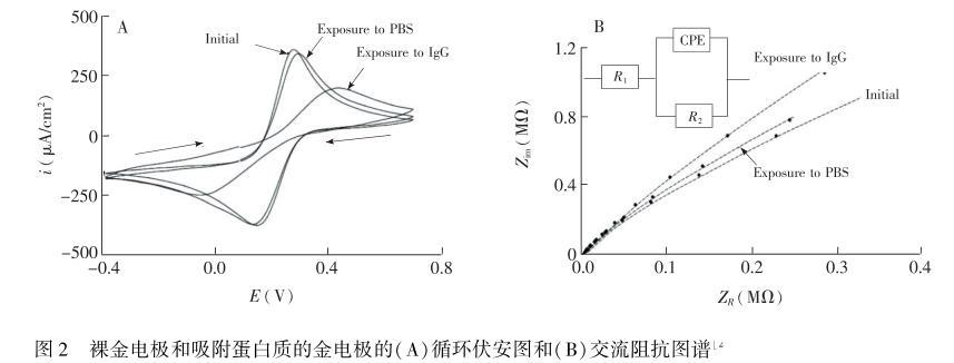 蛋白質吸附會影響電極/電解質界面處靠近電極表面緊密層的結構,從而導致電極雙電層結構(雙電層電容)的改變。研究表明:將電極暴露于蛋白質溶液中,會導致電極/電解質界面處的電子(電荷)轉移電阻(Rct)增加以及電極的Cd1減小。Rct的增加將會導致探針(或待測物)的氧化/還原電位分別正移或者負移(ΔEp增加)。此外,Cd1的改變受到各種檢測條件的影響,例如,當吸附發生在電極開路電位或更高電位時,電極的最大電容更大程度的減小;在相同條件下,與吸附的血清白蛋白相比,免疫球蛋白G(Ig.G)的吸附會導致Cd1減小的更多(圖2)。也有研究表明,吸附的蛋白質導致電極Cd1的變化通常約為裸電極的10%,一般電化學檢測技術(如計時電流法或微分脈沖伏安法)可不考慮,因已經扣除了背景充電電流,或者充電電流相對于法拉第電流衰減的較快。