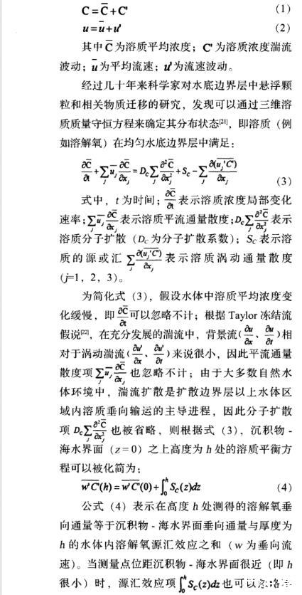 公式(5)表示可以用沉積物-海水界面以上可忽略高度的一點(diǎn)的溶解氧垂向通量近似代表界面通量。