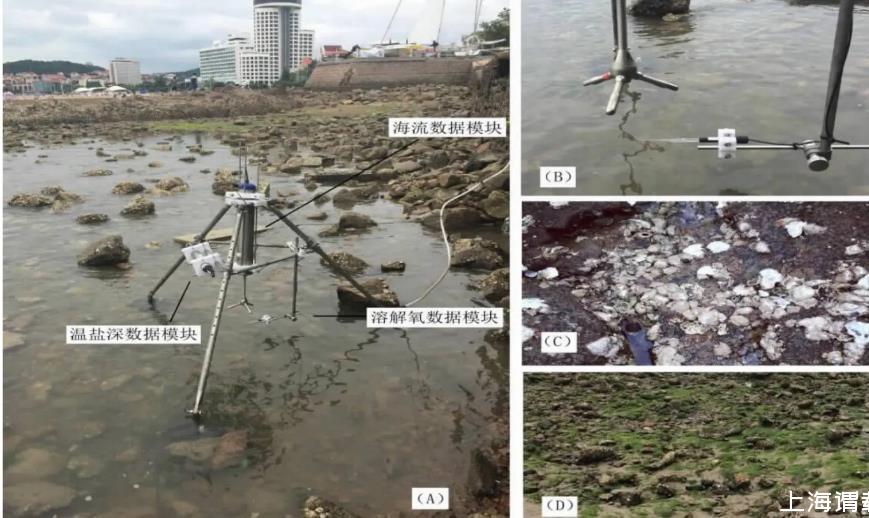 圖2(A)渦動(dòng)相關(guān)系統(tǒng)現(xiàn)場(chǎng)布設(shè)情況;(B)測(cè)點(diǎn)位置情況;(C)長(zhǎng)有貽貝類生物的礫石;(D)長(zhǎng)有藻類生物的礫石