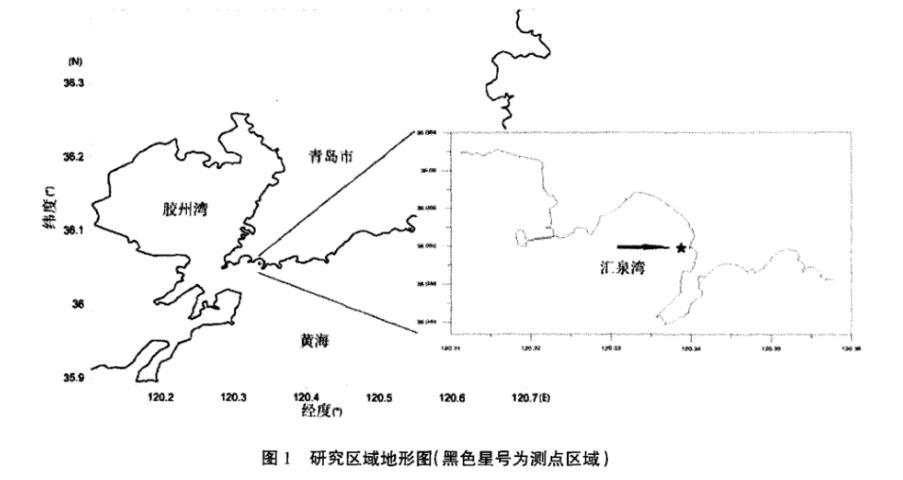 研究區(qū)位于膠州灣以東的匯泉灣(見圖1)。匯泉灣西側(cè)、北側(cè)、東側(cè)三面環(huán)山,以喇叭狀向西南方向開口與黃海相連。海灣高潮時(shí)海岸線寬約1.5km,岸灘走向西北-南東,最大面積為1.24km2,平均水深7m。由于山體阻擋了北向來風(fēng),因此灣內(nèi)主要受SSE向風(fēng)浪影響。匯泉灣為典型的砂質(zhì)海岸,自西北向東南沉積物類型由細(xì)礫、粗砂、中砂、細(xì)砂依次分布變化。海灣潮汐類型屬正規(guī)半日潮,潮流半日周期往復(fù)運(yùn)動(dòng),漲潮時(shí)流向?yàn)轫槙r(shí)針方向,退潮時(shí)流向?yàn)槟鏁r(shí)針方向。匯泉灣內(nèi)0~2cm表層沉積物中葉綠素a含量在1.73~5.71μg/g,2~5cm沉積物中葉綠素a含量在0.51~4.32μg/g范圍內(nèi)。