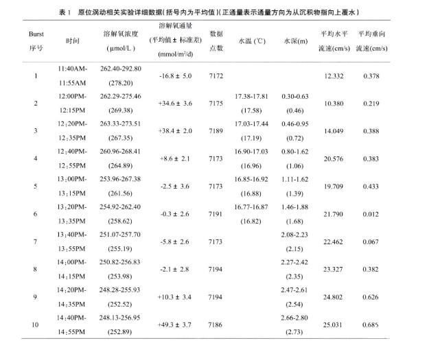 表1原位渦動相關(guān)實驗詳細(xì)數(shù)據(jù)(括號內(nèi)為平均值)(正通量表示通量方向為從沉積物指向上覆水)