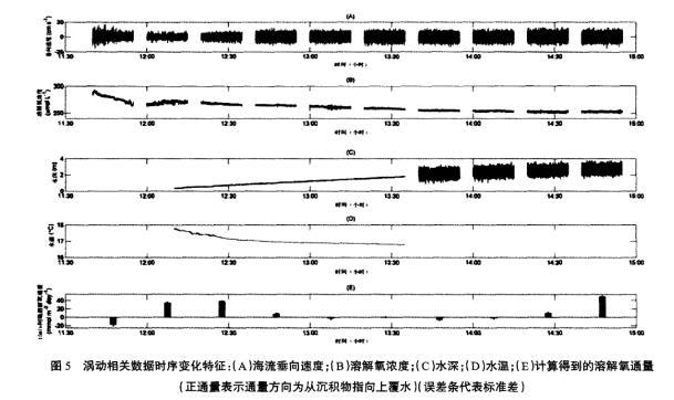 圖5渦動相關(guān)數(shù)據(jù)時序變化特征:(A)海流垂向速度;(B)溶解氧濃度;(C)水深;(D)水溫;(E)計算得到的溶解氧通量(正通量表示通量方向為從沉積物指向上覆水)(誤差條代表標(biāo)準(zhǔn)差)