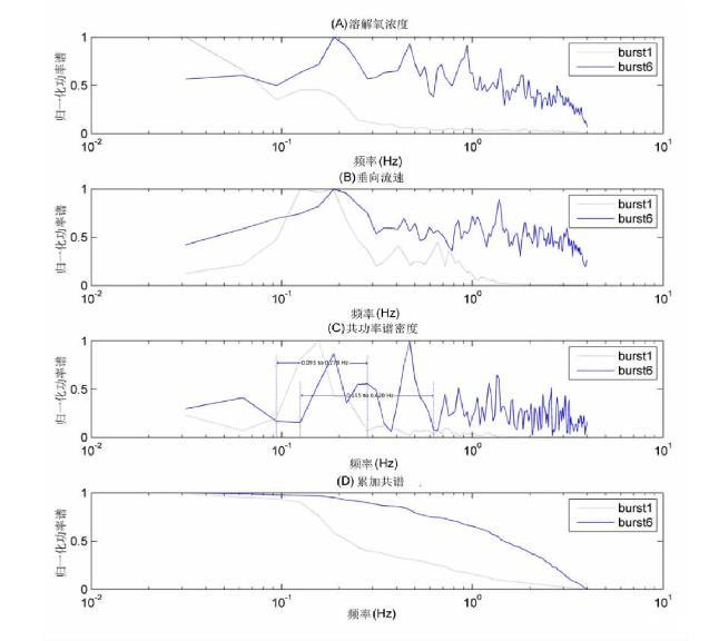 圖8 burst1和burst6功率譜密度計算結果(A)溶解氧濃度歸一化功率譜;(B)垂向流速歸一化功率譜;(C)共功率譜密度;(D)累加共譜