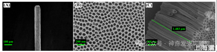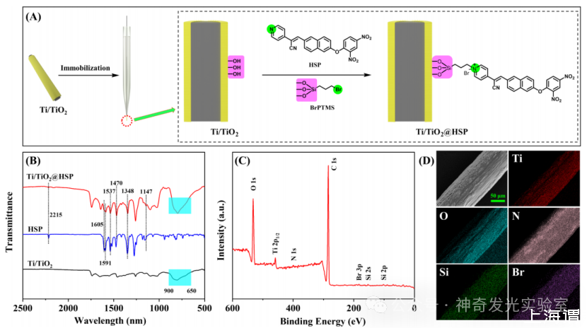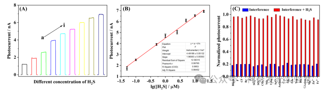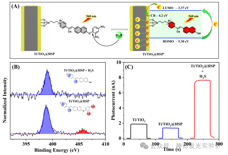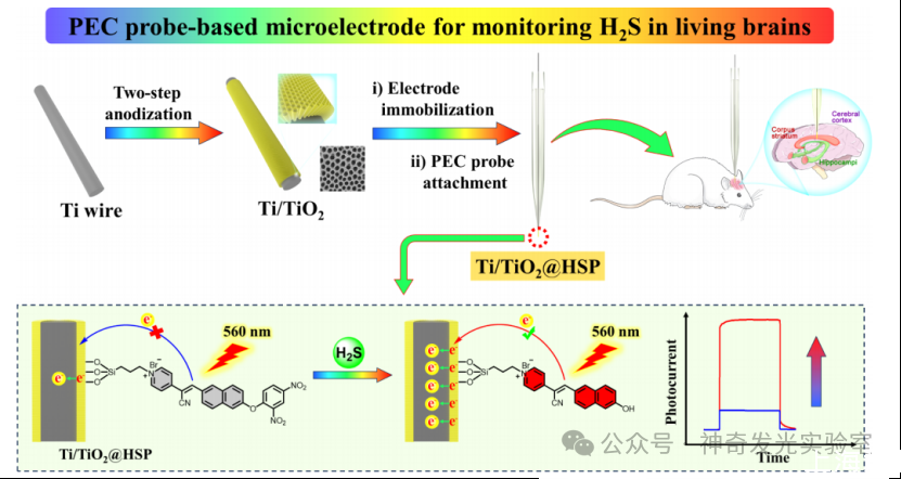 湖南科技大學(xué)陳述教授團(tuán)隊(duì)開(kāi)發(fā)了一種基于Ti/TiO2(鈦絲/TiO2納米管陣列)底物和有機(jī)PEC探針的PEC微電極,用于體內(nèi)H2S的定量測(cè)定。利用有機(jī)探針實(shí)現(xiàn)了對(duì)目標(biāo)的特異性識(shí)別和光響應(yīng)。有機(jī)PEC探針具有明確的結(jié)構(gòu),可以合理設(shè)計(jì)為包含選擇性反應(yīng)基團(tuán),其結(jié)構(gòu)和光物理性質(zhì)易于調(diào)整,使其在PEC傳感器中應(yīng)用有效。通過(guò)控制鈦絲的陽(yáng)極氧化,得到Ti/TiO2的微電極基底,原位生成二氧化鈦納米管。在構(gòu)建Ti/TiO2 HSP光電電極的過(guò)程中,將H2S特異性識(shí)別探針(HSP)共價(jià)結(jié)合到二氧化鈦表面。這種結(jié)構(gòu)模擬了染料敏化太陽(yáng)能電池電極的典型配置,其中納米結(jié)構(gòu)的二氧化鈦提供了一個(gè)大的表面積,有利于與有機(jī)染料的大量結(jié)合,而二氧化鈦?zhàn)鳛橐粋€(gè)有效的光電子集電器,為強(qiáng)光電流響應(yīng)提供了基礎(chǔ)。